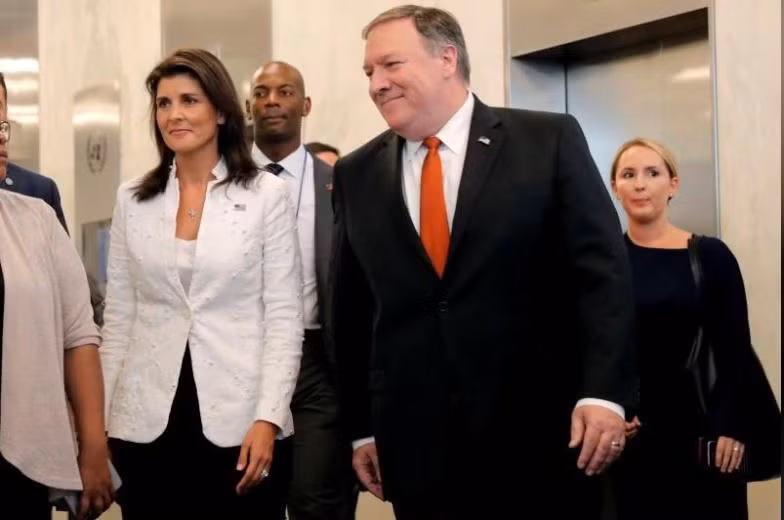 Ngoại trưởng Mike Pompeo và đại sứ Mỹ tại Liên Hợp Quốc Nikki Haley tại một buổi họp báo ở trụ sở Liên Hợp Quốc. Ảnh: Reuters