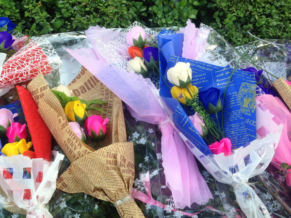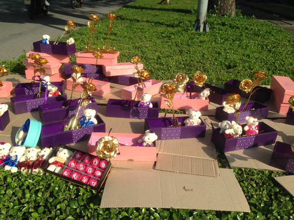 Mới đầu giờ sáng, tuyến đường Nguyễn Văn Cừ, An Dương Vương (Q.5), đoạn trước cổng trường ĐH Khoa học Tự nhiên TPHCM và ĐH Sài Gòn, rất nhiều hoa và gấu bông được bày bán.