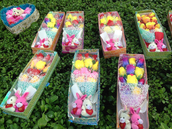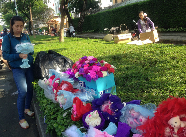 Ngoài hoa tươi, hoa khô, hoa giấy dún, hoa gấu bông… cũng bày bán la liệt trước nhiều trường như ĐH Kinh tế TPHCM, ĐH Sư phạm, ĐH Bách Khoa, ĐH KHXH&NV... Tuy không lo việc sản phẩm mau hư nếu qua ngày, nhưng người bán cũng rầu rĩ vì… ế khách. “Mỗi bông hoa làm bằng giấy dún chỉ 5.000 đồng, có thể làm kỷ niệm quanh năm nhưng khách không mặn mà. Có lẽ nhu cầu khách hàng năm nay thích quà thực tế nhưng những món quà tinh thần như thế này. Tôi buôn hoa đã 10 cái 20/10, chưa năm nào vắng như năm nay” – bà Thiện bán hoa gấu bông tại đây bộc bạch.