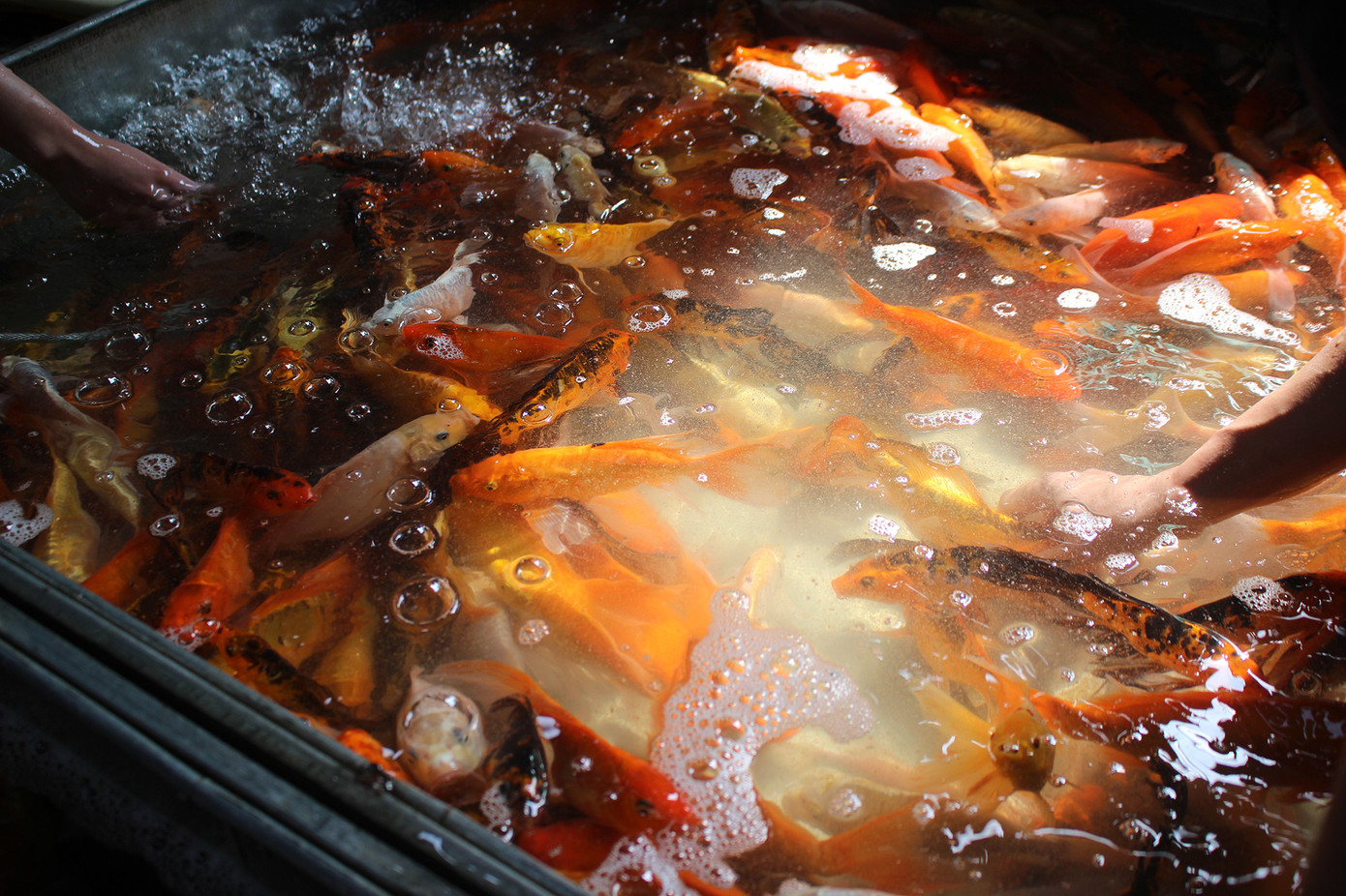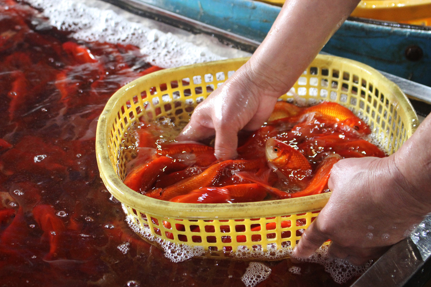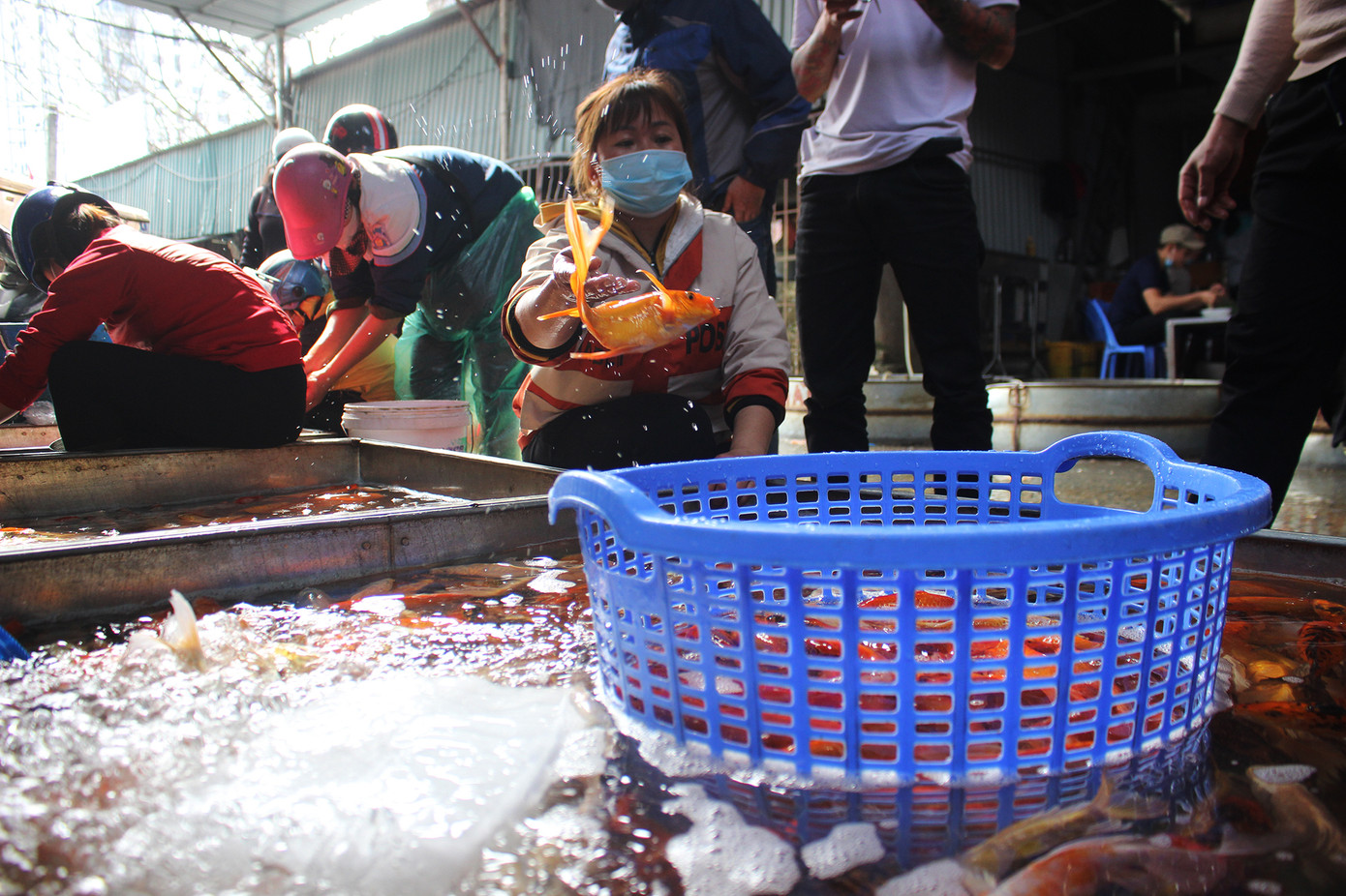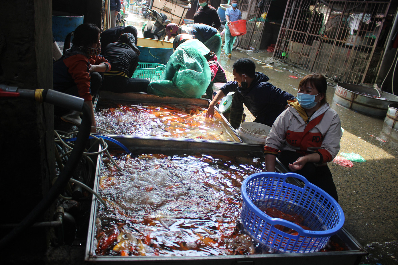 Đã thành thông lệ, sát ngày cúng tiễn ông Công, ông Táo chầu trời (23 âm lịch), tiểu thương chợ cáYên Sở (phường Yên Sở, quận Hoàng Mai, Hà Nội) - Chợ thuỷ sản đầu mối lớn nhất Hà Nội - lại tấp nập hơn thường nhật bởi lượng người đến mua cá chép đỏ tăng cao.