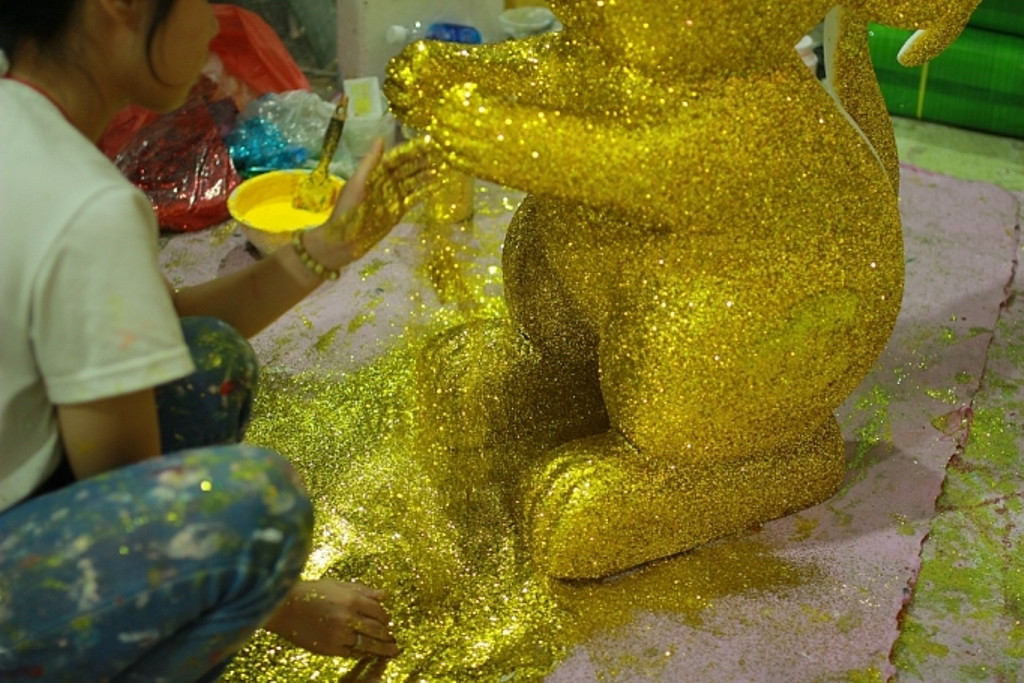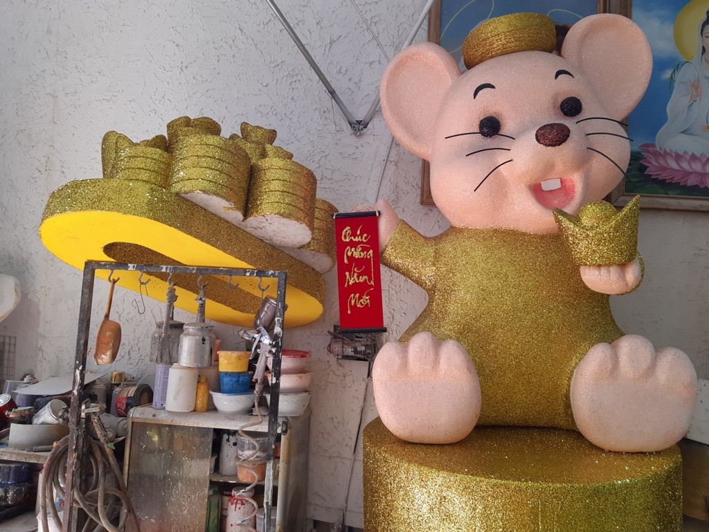 Để tạo thành những chú chuột ngộ nghĩnh này, người thợ cắt tạo hình từ mốp, sau đó sơn màu, phủ kim tuyến vàng sặc sỡ để sản phẩm thêm bắt mắt.