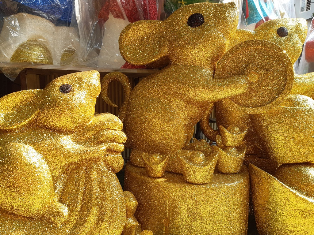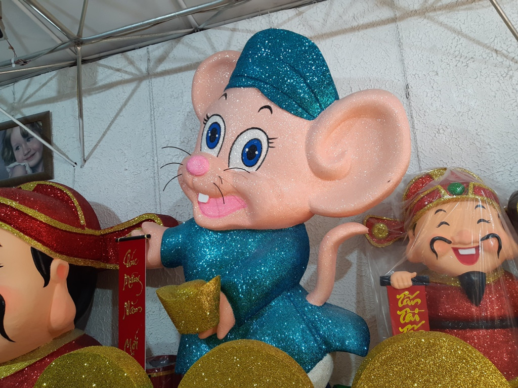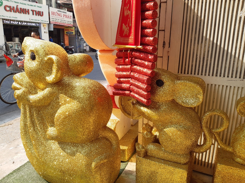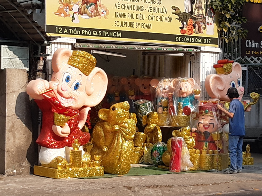 Trên nhiều tuyến đường Trần Phú, Trần Hưng Đạo (Q.5)..., chuột vàng làm bằng mốp được bày ra tận đường thu hút sự quan tâm của nhiều chú ý của quan khách.