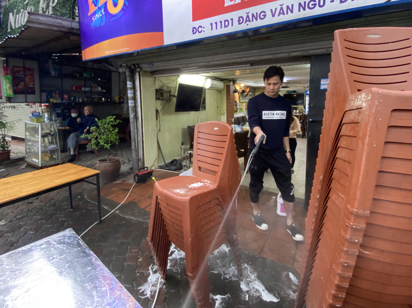 Lau dọn bàn ghế chuẩn bị cho buổi bán hàng trưa nay, anh Kiên, chủ quán lẩu gà (Đặng Văn Ngữ, Hà Nội) cho biết, quán vẫn bán online trong thời gian nghỉ dịch nên việc mở cửa hôm nay không quá đột ngột, nguyên liệu và nhân lực đều đã sẵn sàng. Anh Kiên chia sẻ: “Mình chỉ nhận một lượng khách cố định, bàn ghế kê đảm bảo giãn cách, khách hàng trước khi vào quán phải rửa tay sát khuẩn”