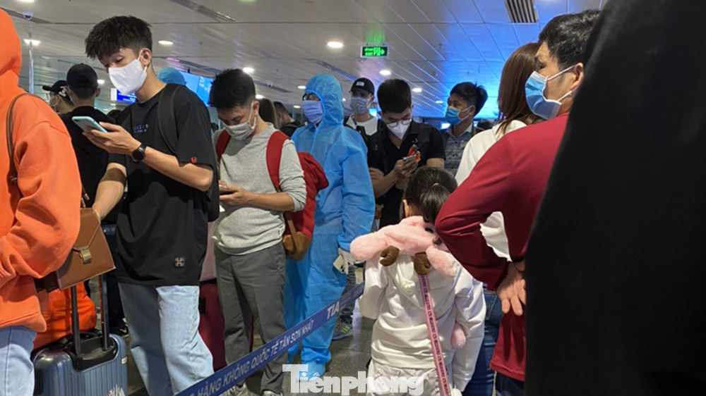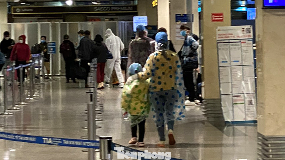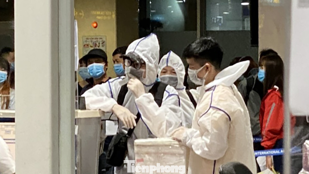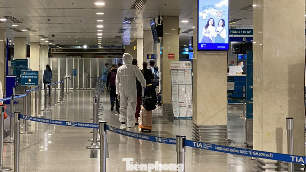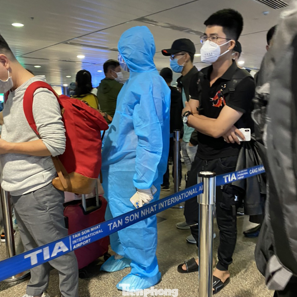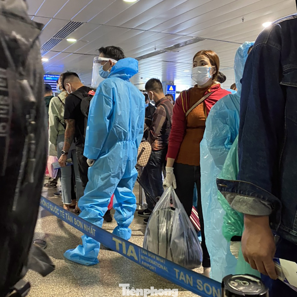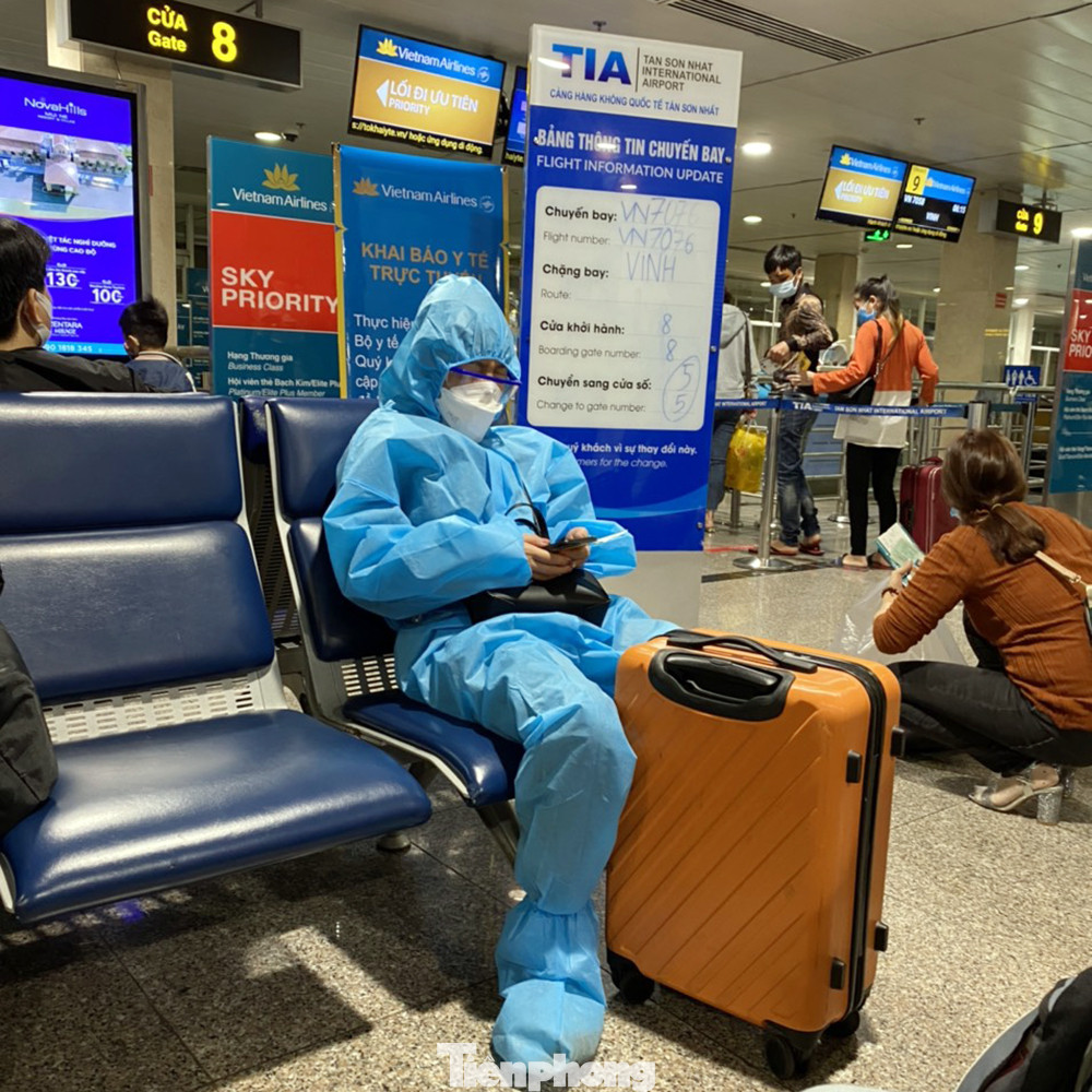 Nhiều người đi máy bay xuất phát từ sân bay Tân Sơn Nhất đã trang bị rất kỹ lưỡng trang phục bảo hộ phòng dịch.