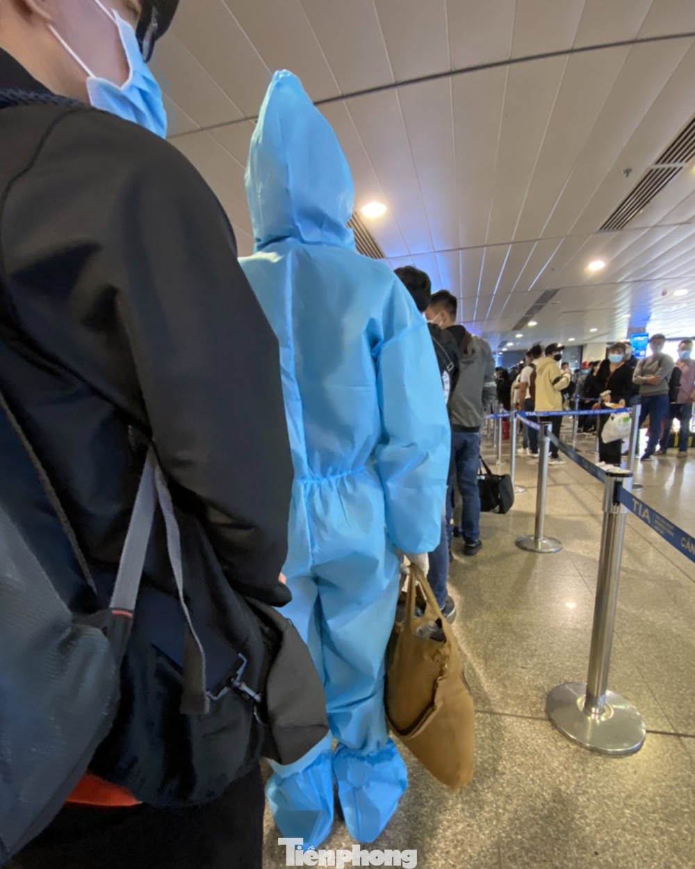 Hành khách đứng check in kín mít trong trang phục phòng dịch Covid-19.