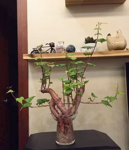 Trên mạng xã hội, mọi người thi nhau khoe thành quả trồng khoai trong bình nước hoặc chậu đất. Những chậu cây bé xinh được gọi với cái tên mỹ miều "khoai lang bon sai".