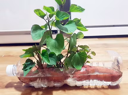 Chị Ngọc Lan, ở Quảng Ninh, còn tỉ mỉ cắt chai nước làm không gian sống cho khoai lang.