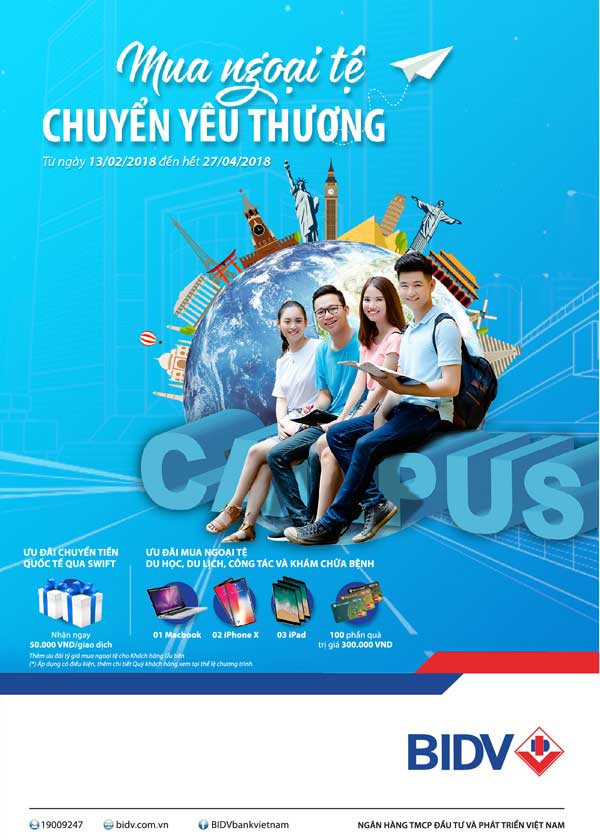 Ngoài ra, BIDV thường xuyên có các gói ưu đãi như chương trình “Mua ngoại tệ chuyển yêu thương” (áp dụng từ nay đến 27/4/2018, với quà tặng ngay 50.000 đồng khi chuyển tiền quốc tế và nhiều phần quà tặng giá trị như máy tính xách tay macbook, Iphone X, Ipad, và hàng trăm giải thưởng bằng tiền mặt trị giá 300,000 đồng khi mua ngoại tệ).