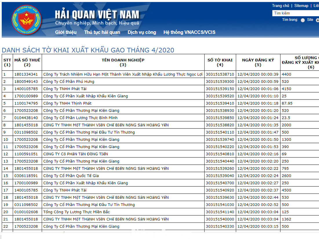 Theo tìm hiểu của Tiền phong, trong số 39 DN trên thì DN đăng ký tờ khai thành công đầu tiên là Cty TNHH MTV XNK Lương thực Ngọc Lợi, vào lúc 0h00p39s. Tổng cộng DN này đăng ký được 16 tờ khai, trong đó tờ khai cuối cùng được thực hiện vào lúc 1h04p04s. Tổng lượng gạo công ty này đăng ký là 16.290 tấn.