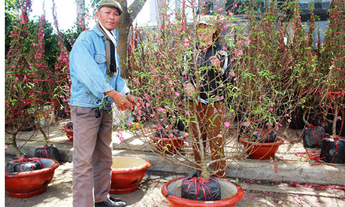 Loại cây cảnh miền Bắc hút khách Tây Nguyên tiếp theo là hoa đào. Anh Phạm Văn Long (Nam Trực, Nam Định) cho hay: Gần 20 năm nay, cứ tết đến là gia đình anh lại “Nam tiến” đưa khoảng 250 gốc đào do gia đình trồng vào Đắk Lắk bán. Anh Long cho hay, chăm đào phải có kỹ thuật canh tỉa đúng thời điểm cho hoa bung đúng tết. Năm nay, nhiều vườn đào quê anh rụng lá, nở hoa sớm không bán được. Hoa đào “khát” hàng song anh Long vẫn giữ giá bán dao động từ 800 - 1triệu đồng/chậu. Khách chơi hoa đào phần lớn quê Bắc, tìm không khí xuân miền Bắc qua cành đào hồng thắm quyến rũ.