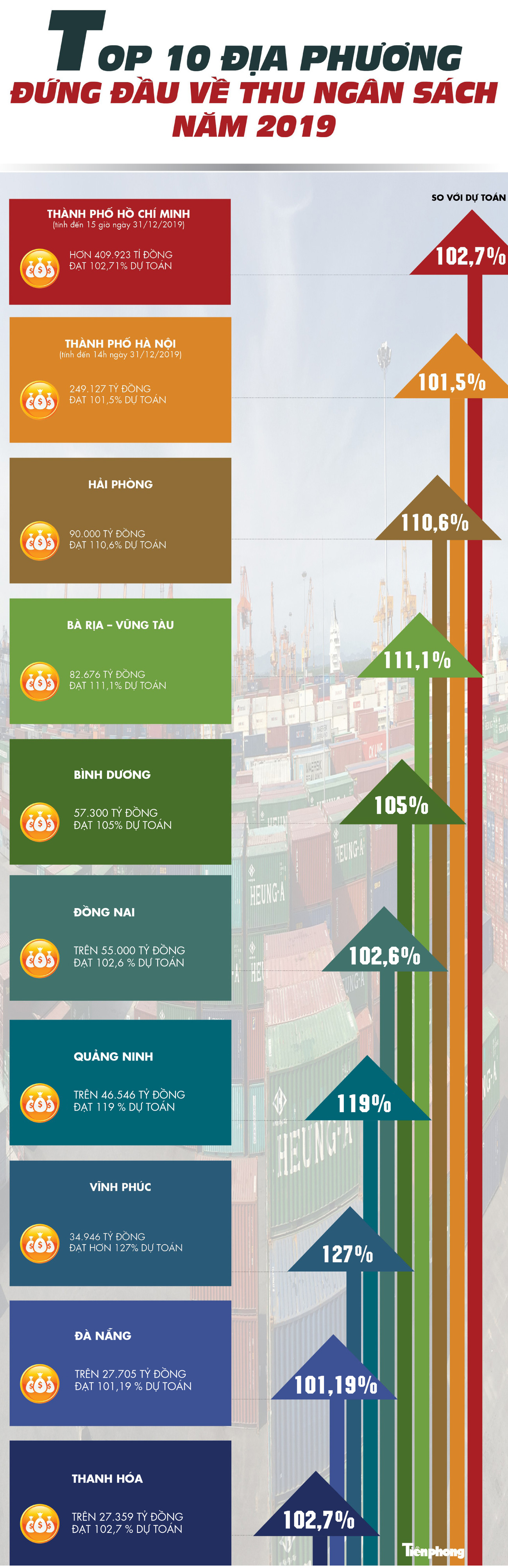 TPO - Năm 2019, tổng thu ngân sách địa phương vượt 16% dự toán Quốc hội giao, 63/63 tỉnh thành đều hoàn thành và hoàn thành vượt mức dự toán. Trong đó, đứng đầu là TP.HCM, Hà Nội, Hải Phòng...