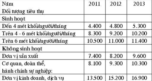| Bảng giá nước áp dụng trong giai đoạn 2011 - 2013 ( đơn vị tính: đồng/m3