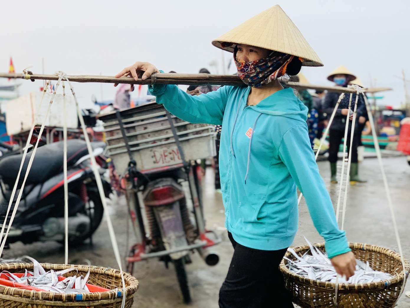 Người dân gánh cá ra chợ bán sau khi thu mua từ các chủ thuyền đánh bắt ngoài khơi trở về.