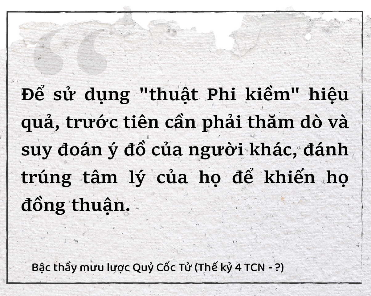 Quỷ Cốc Tử cho rằng, để sử dụng “Phi kiềm” hiệu quả, trước tiên cần phải thăm dò và suy đoán ý đồ của đối phương, từ đó dùng những lời lẽ xúc động, đánh trúng tâm lý nhằm thuyết phục họ đồng thuận với mục đích của mình. Trong lịch sử, Phạm Thư (280 - 208 TCN) là một trong những nhân vật tiêu biểu vận dụng thành công thuật “Phi kiềm”. Ông xuất thân nghèo khó nhưng nhờ tài năng ứng biến và khả năng du thuyết xuất chúng, đã vươn lên vị trí tể tướng nước Tần, góp phần đưa quốc gia này trở thành một thế lực hùng mạnh thời Chiến Quốc.