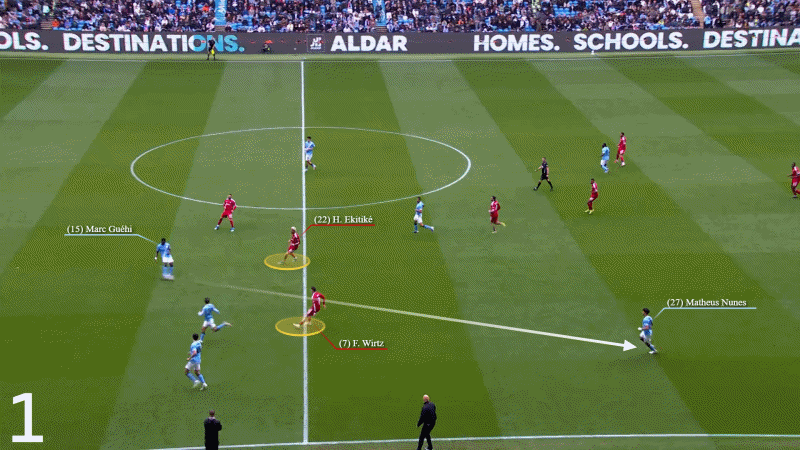 Trong 35 phút đầu trước Man City, Liverpool có những đoạn chơi tốt khi luân chuyển xuyên tuyến từ phía sau, và khả năng tìm thấy khoảng trống để “luôn sẵn sàng nhận bóng” của Wirtz là mấu chốt. Anh liên kết với Hugo Ekitike để tạo ra một cơ hội sớm bằng cách tìm đúng không gian khiến đối thủ bất ngờ.