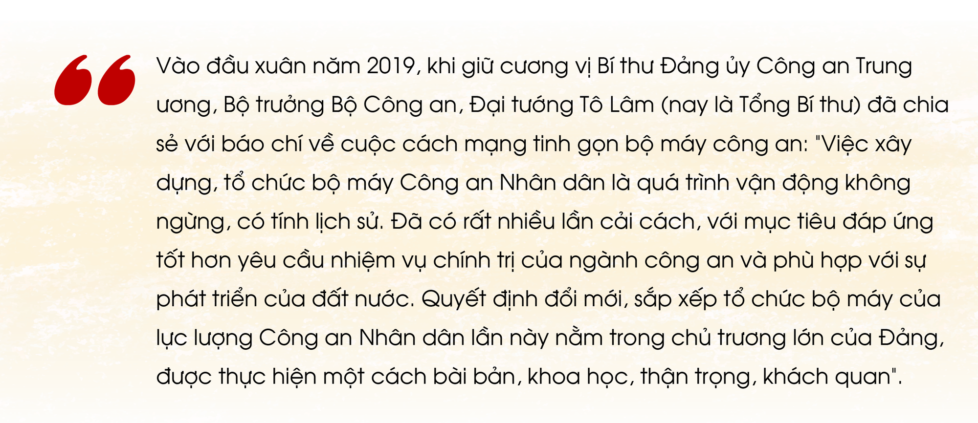 Và hành trình tinh gọn bộ máy của Bộ Công an bắt đầu từ năm 2018, với quyết tâm tiên phong, Bộ Công an đã mạnh dạn xóa bỏ 6 tổng cục, và cắt bỏ hàng loạt tầng nấc trung gian. Từ đó đến nay, bộ máy tổ chức của Bộ Công an đã tinh giảm 6 tổng cục, 1 đơn vị tương đương tổng cục, 55 đơn vị cấp cục, 7 trường Công an nhân dân, 20 đơn vị Cảnh sát phòng cháy chữa cháy cấp tỉnh, 1.200 đơn vị cấp phòng và trên 3.500 đơn vị cấp đội. Cùng với đó, Bộ Công an đã tiến hành đồng bộ các giải pháp cơ cấu lại đội ngũ cán bộ ở các cấp công an theo phương châm “Bộ tinh, tỉnh mạnh, huyện toàn diện, xã bám cơ sở”.