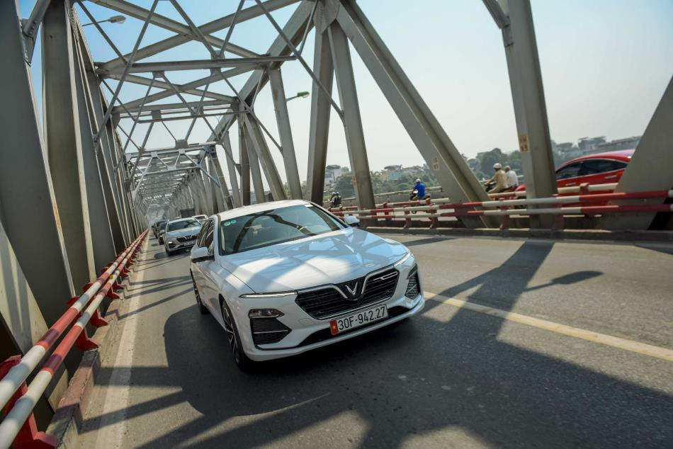Đoàn xe gồm 16 chiếc VinFast Lux nối đuôi nhau vượt cầu Chương Dương khiến nhiều người tò mò ngoái nhìn. Một số người dân Hà Nội đã tranh thủ dùng điện thoại ghi lại khoảnh khắc ấn tượng này