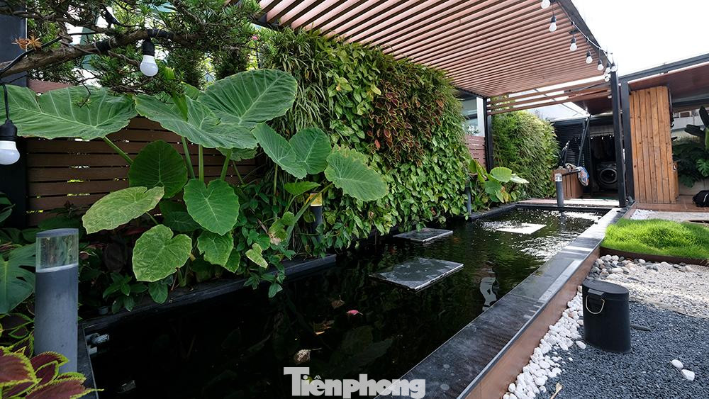 | Tại khu vực sân chính vuông vắn dành cho những bữa tiệc BBQ, anh Tùng dành diện tích cho hồ cá Koi và những khu vườn thủy canh thẳng đứng. |