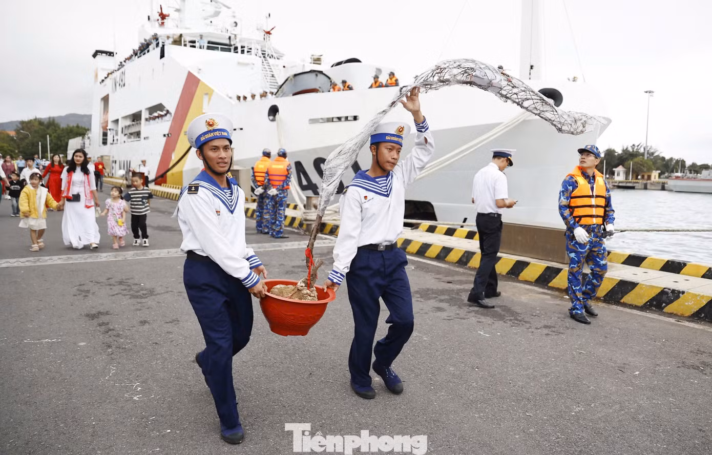 | Ngày 26/12, tại Quân cảng Cam Ranh, UBND tỉnh Khánh Hòa và Bộ Tư lệnh Vùng 4 Hải quân tổ chức lễ tiễn đoàn công tác đi thực hiện nhiệm vụ và chúc Tết cán bộ, chiến sĩ, Nhân dân trên Quần đảo Trường Sa nhân dịp Tết Ất Tỵ 2025. Trong ảnh là các cán bộ, chiến sĩ lên đường thực hiện nhiệm vụ tại Trường Sa. Ảnh: Như Ý. |