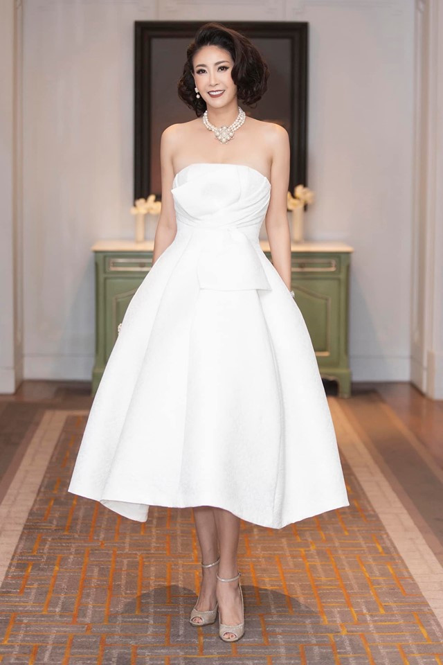 Hoa hậu Hà Kiều Anh yêu kiều và dịu dàng với bộ váy trắng cúp ngực.