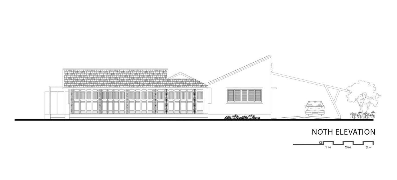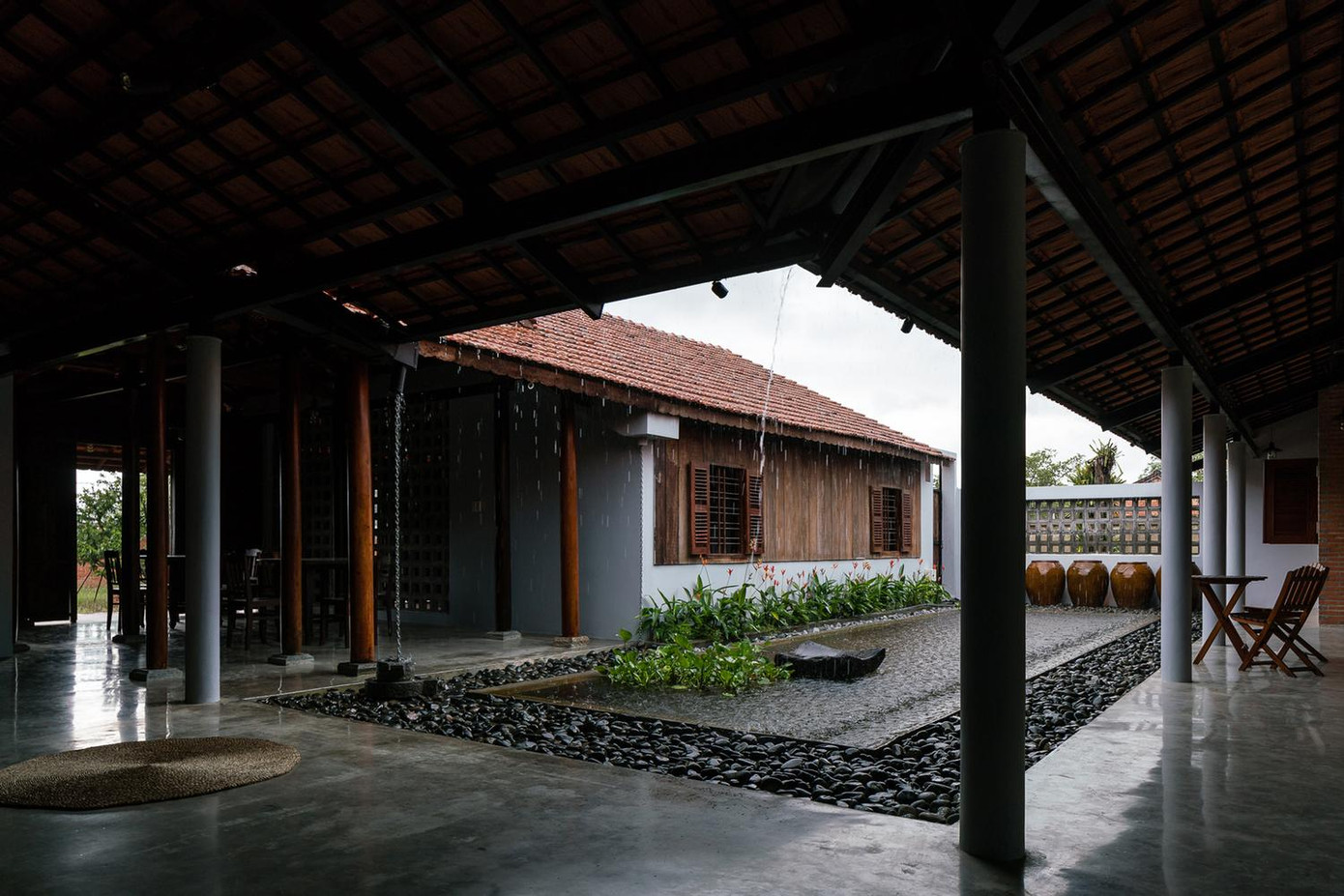 | | Hành lang và phòng khách là không gian mở bên trong, thông với các phòng ngủ của ông bà, bố mẹ, các cháu. |  | | Phòng ngủ vẫn giữ được sự riêng tư cần thiết và liên kết với các không gian chung như hành lang, hồ nước, sân, phòng ăn, bếp tạo không gian giao tiếp gần gũi giữa các thành viên. |  | | Hầu hết các đồ nội thất bằng gỗ trong nhà đều có tuổi đời hơn nửa thế kỷ, được tận dụng từ những món đồ nội thất cũ được chuyển giao qua nhiều thế hệ và được bảo quản như những vật gia bảo.  | | Mái ngói vừa có tác dụng làm mát ngôi nhà vừa lưu giữ nét mộc mạc, giản dị của ngôi nhà Việt xưa. | |  | | Ngôi nhà được bao quanh bởi một ruộng lúa thâm canh theo mùa và một số công đất trồng dưa. Đây cũng chính là nơi an cư lạc nghiệp như mong muốn của gia chủ.  | | Bản vẽ thiết kế của ngôi nhà. | | |
