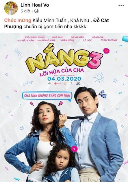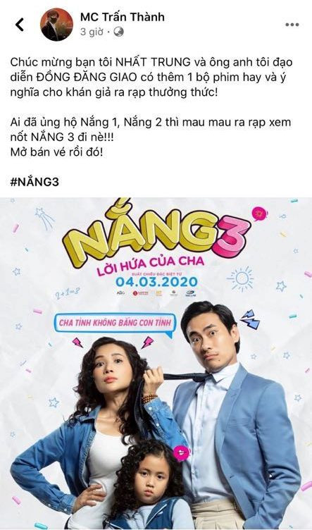 Riêng Trấn Thành không quên chúc mừng ê-kíp và kêu gọi fan “cứng” của Nắng tiếp tục ủng hộ nốt Nắng 3: Lời Hứa Của Cha.