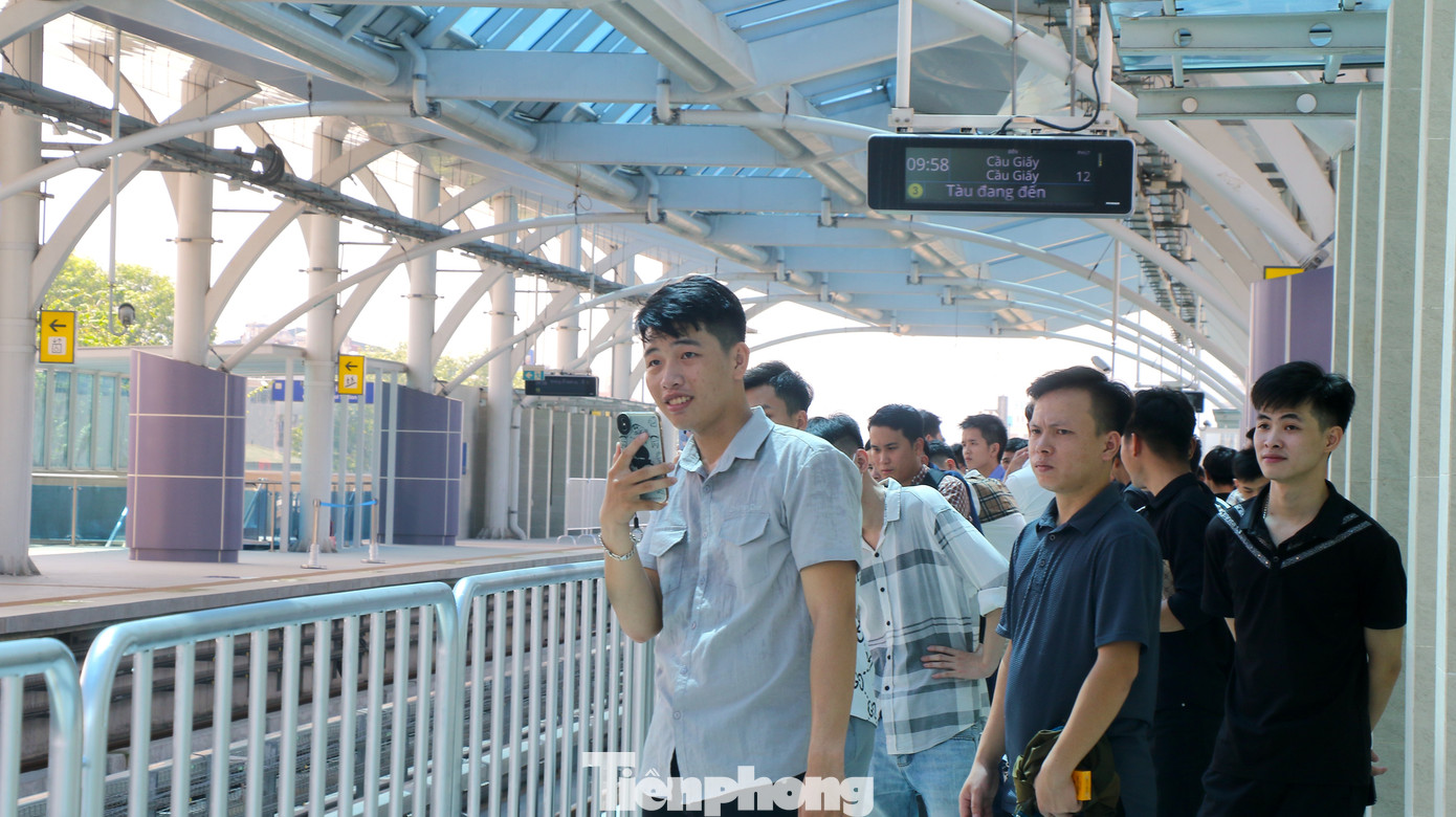 | Hành khách thích thú trải nghiệm, check-in metro Nhổn - ga Hà Nội trong ngày đầu đi vào vận hành thử nghiệm. |