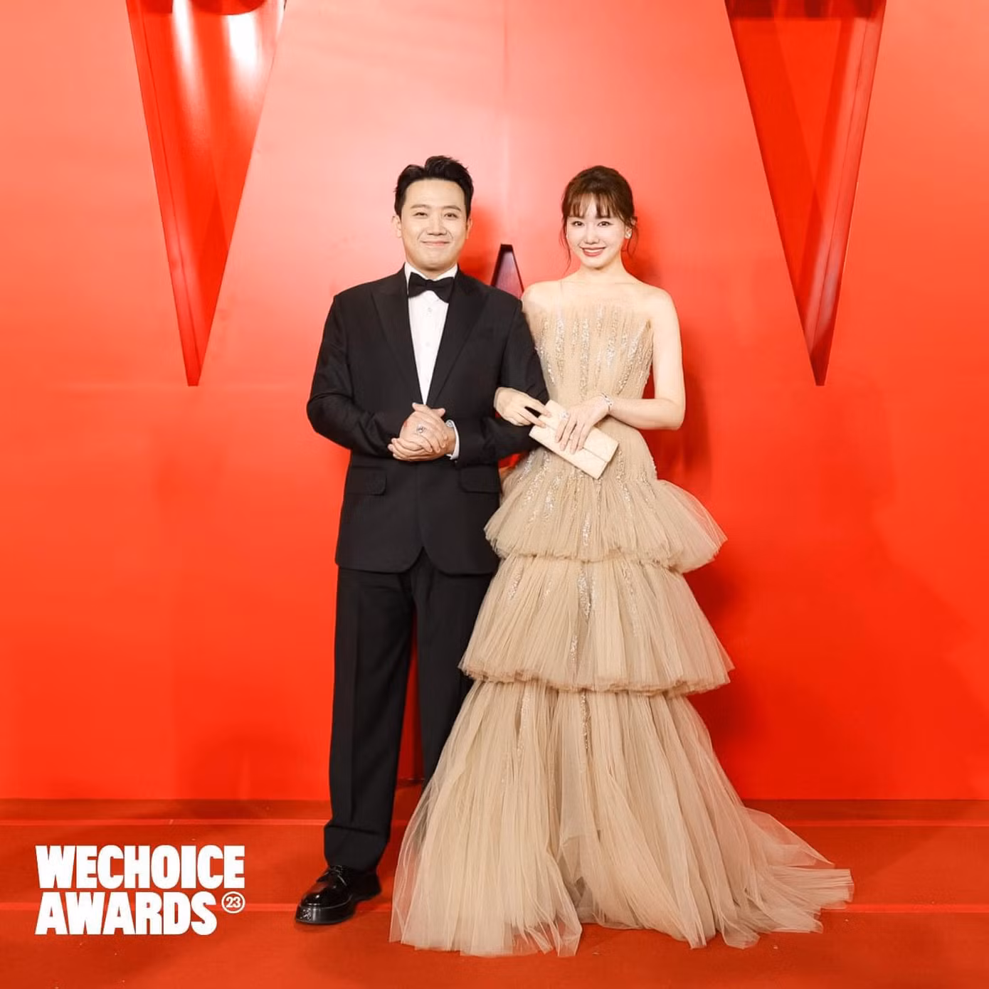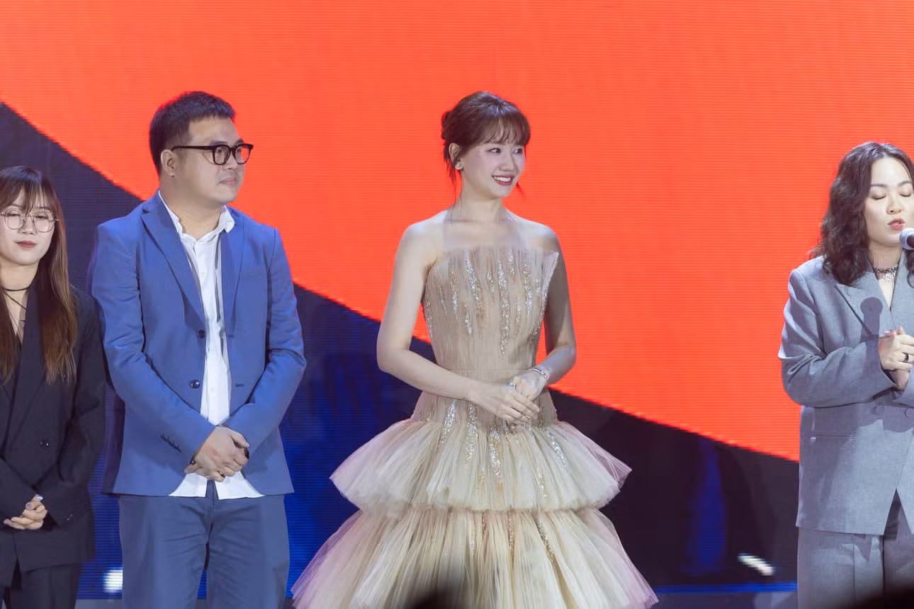 Hari Won sánh đôi cùng MC Trấn Thành với thiết kế màu kem mang đậm dấu ấn của NTK Phan Huy. Nữ ca sĩ 38 tuổi trẻ trung với mẫu váy cúp ngực, xếp lớp 3 tầng.