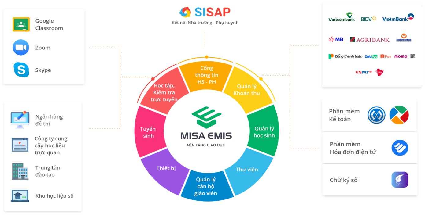 Đặc biệt, nền tảng giáo dục MISA EMIS là giải pháp tiên phong trên thị trường triển khai phương thức thanh toán học phí không dùng tiền mặt tại các đơn vị trường học. Áp dụng công nghệ số, tính năng này đã hỗ trợ tối ưu nghiệp vụ cho cán bộ kế toán và giáo viên của nhà trường, giảm 80% thời gian so với cách nộp học phí truyền thống, thay đổi hoàn toàn thói quen thu học phí của Nhà trường và đóng học phí của Phụ huynh. Việc đối soát thanh toán hoàn toàn tự động qua phần mềm, tức thời và không xảy ra sai sót, giúp các đơn vị trường học quản lý khoản thu tức thời thông qua báo cáo trực quan.