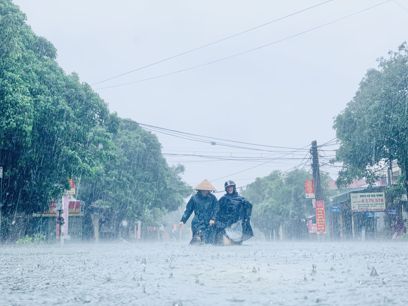 Tại đường Nguyễn Công Trứ (TP Hà Tĩnh) nước ngập sâu trên nửa mét. Toàn bộ tuyến đường bị tê liệt, người dân phải lội bộ để di chuyển đến những khu vực cần thiết.