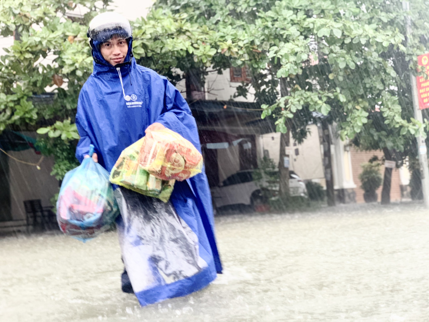 Nhiều người đội mưa, lội đường ngập để đi mua những vật dụng cần thiết trong mùa mưa lũ này.