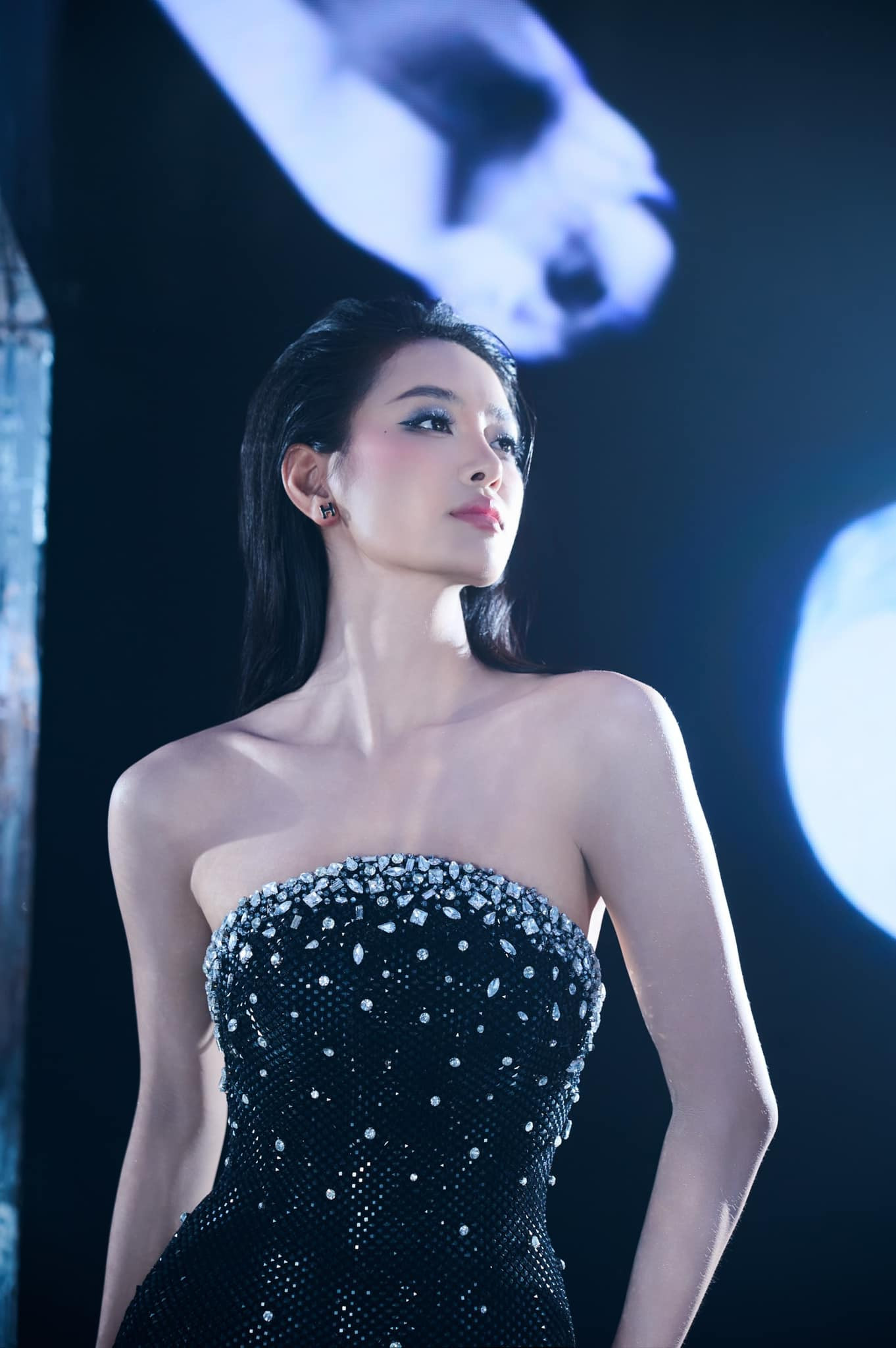Á hậu Bùi Khánh Linh lựa chọn kiểu tóc vuốt ngược, layout makeup nhấn vào đôi mắt sắc sảo, tông màu nhũ xanh hiện đang thịnh hành. Mỹ nhân Đảo Thiên Đường tiết chế trang sức, tạo ra diện mạo sang trọng, tinh tế.