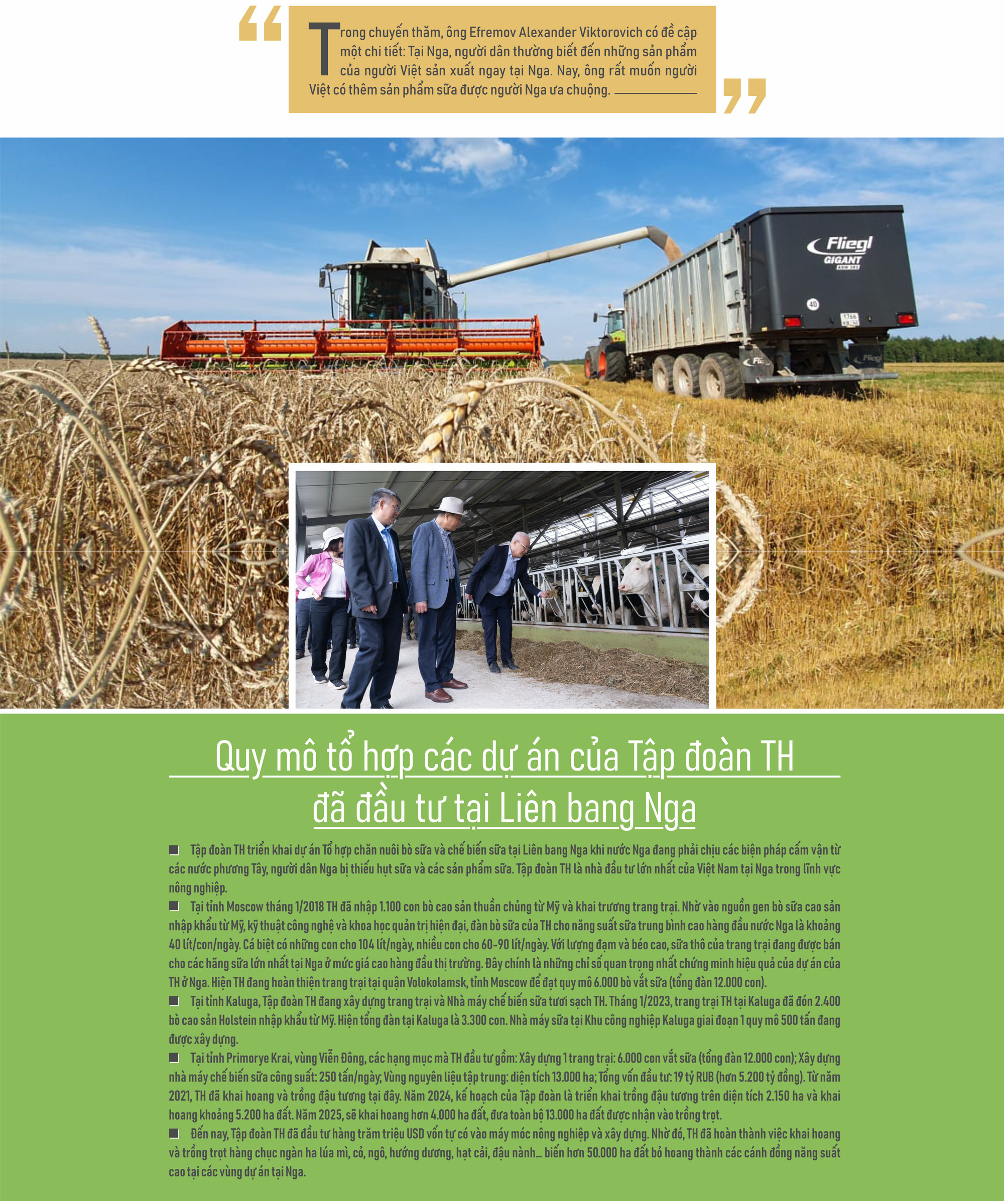 Trong cuộc họp báo sau hội đàm với Chủ tịch nước Tô Lâm ngày 20/6/2024, Tổng thống Nga Vladimir Putin đã phát biểu: "Quan hệ đối tác song phương trong lĩnh vực nông nghiệp đang phát triển. Nguồn cung nông sản lẫn nhau đang tăng lên và loại sản phẩm ngày càng phong phú hơn. Tập đoàn TH của Việt Nam đang xây dựng các nhà máy chế biến sữa ở một số vùng của Nga, bao gồm vùng Kaluga và vùng Primorye. Năm ngoái, việc xây dựng phần thứ nhất của khu liên hợp chăn nuôi ở ngoại ô Moscow với quy mô 6000 bò cho sữa đã hoàn thành".