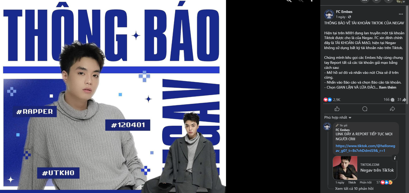 Tuy nhiên, tối 11/12, FC của NEGAV đưa ra cảnh báo rằng đây là tài khoản giả mạo cùng thông báo về việc hiện tại NEGAV không sử dụng bất kỳ tài khoản nào trên TikTok.