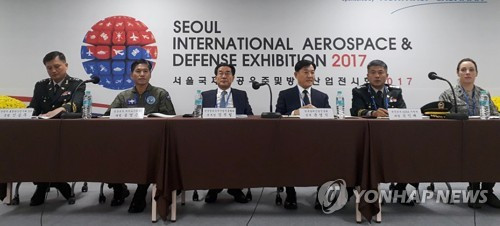 Ông Jang Suk-chul, Phó chủ tịch của Hiệp hội Công nghiệp Hàng không Hàn Quốc (thứ ba từ trái sang) tham dự buổi họp báo về sự kiện ADEX 2017 tại căn cứ không quân Seoul hôm nay, 16/10. Ảnh: Yonhap