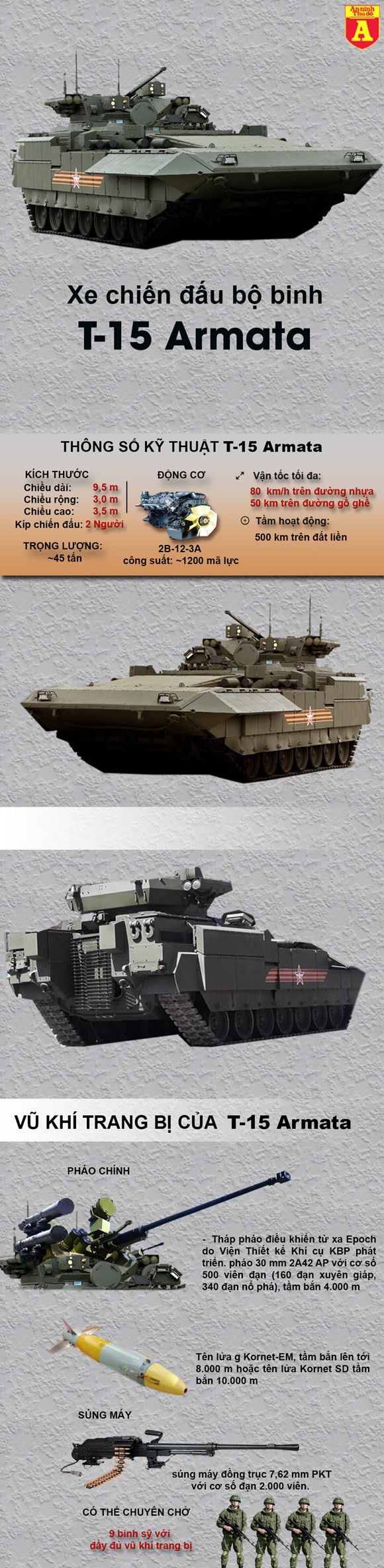 T-15 Armata là sự kết hợp đặc điểm của hai loại xe quân sự — xe chiến đấu bộ binh và xe bọc thép hạng nặng ra mắt vào năm 2015. T-15 Armata có cấp độ xe tăng giáp bảo vệ, trọng lượng chiến đấu là 45 tấn, nhưng lại có thể tăng tốc tới 70 km/h, vượt BMP "Bradley" tốc độ cao của Mỹ, tuy loại này chỉ nặng khoảng 30 tấn. Ngoài ra, T-15 Armata được trang bị một trong những hệ thống chống tên lửa "Kornet" mạnh nhất trên thế giới.