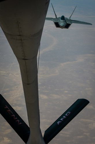 Đối với một chiếc F-22, nó có tầm hoạt động tối đa lên đến 2.960km nếu như sử dụng pod nhiên liệu phụ. Bản thân dòng chiến đấu cơ này chỉ có thể mang theo tối đa 2.2 tấn vũ khí các loại bao gồm cả pod nhiên liệu nếu có, do đó việc sử dụng các máy bay tiếp liệu trên không có vai trò rất lớn đối với khả năng tác chiến của F-22. Nguồn ảnh: Dvids Hub.
