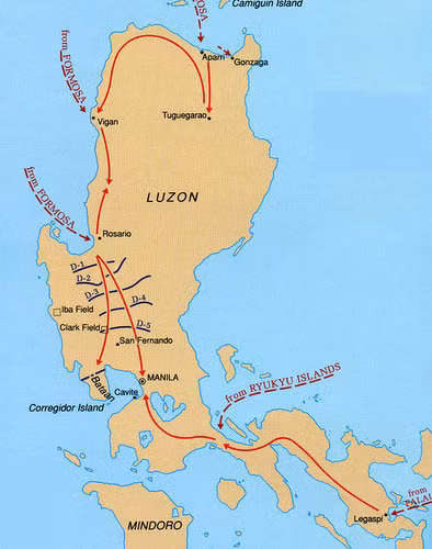 Sơ đồ tiến quân của Nhật sau trận ném bom sân bay Clark. Ảnh: Wikipedia.