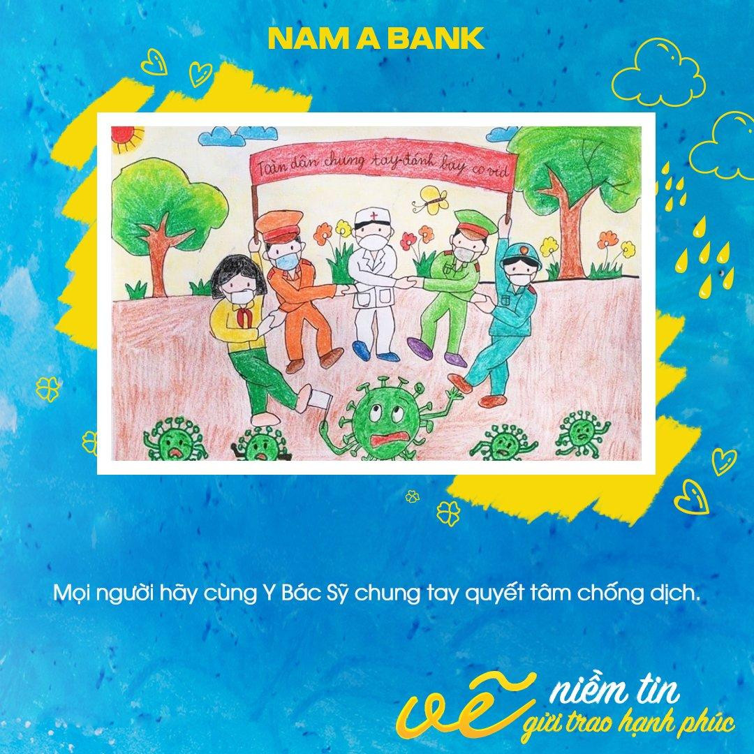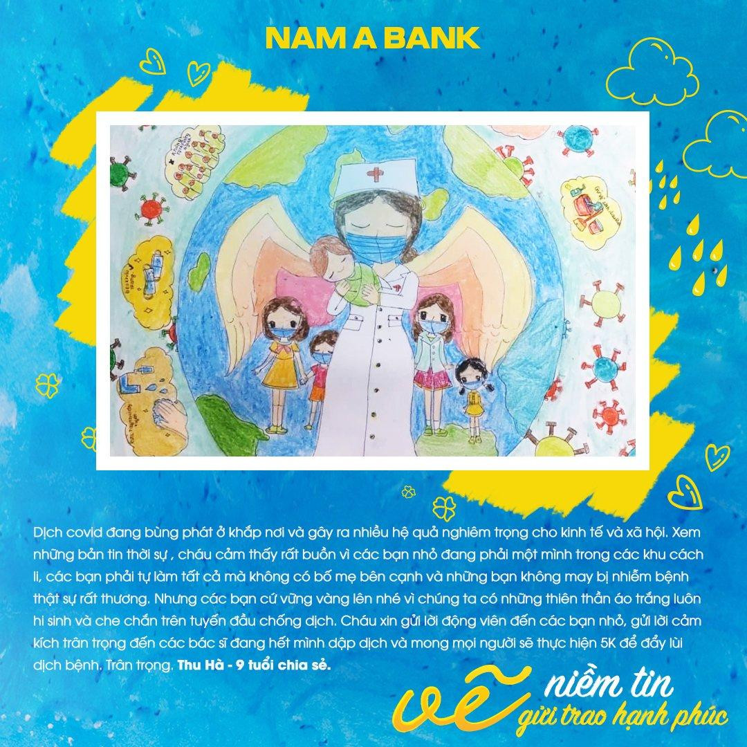 Ngày 10/6, Nam A Bank phát động cuộc thi vẽ tranh ủng hộ tuyến đầu chống dịch với chủ đề “Vẽ niềm tin - Gửi trao hạnh phúc”. Chỉ sau vài ngày phát động, cuộc thi đã nhận được hàng trăm bức tranh của các em thiếu nhi trên cả nước nhằm thể hiện những cảm nhận, suy nghĩ, tình cảm, tri ân đối với các y bác sĩ tuyến đầu chống dịch và góp phần tiếp thêm động lực, tinh thần cho đội ngũ y bác sĩ sớm hoàn thành nhiệm vụ.