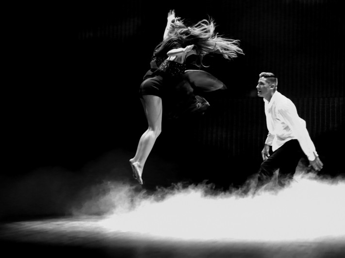 TPO - Nữ ca sĩ diện đầm ánh bạc khoe vòng một lấp ló, đôi chân thon dài nuột nà khi tạo dáng bên bạn nhảy ngoại quốc điển trai, trong hậu trường đêm mở màn Bước Nhảy Hoàn Vũ 2014.