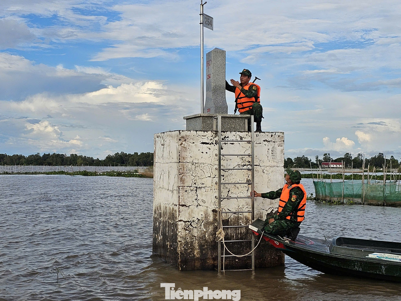 Chiến sĩ Đồn Biên phòng Nhơn Hội kiểm tra cột mốc 254 nằm giữa đồng nước. Ảnh: Hòa Hội