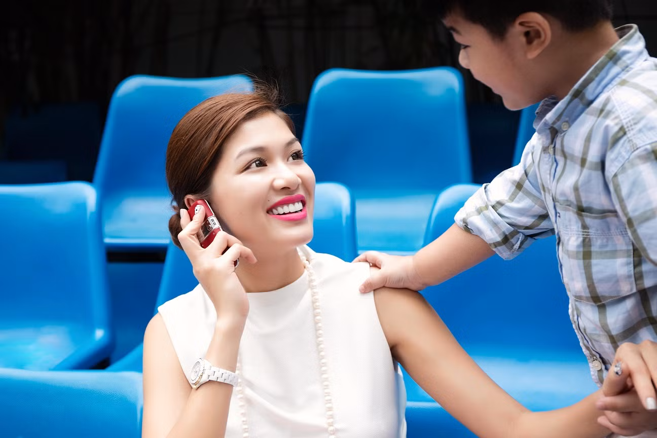 Oanh Yến rất bận rộn nhưng vẫn dành thời gian cho cô. Cô vừa trông con vừa tranh thủ giải quyết công việc qua điện thoại.