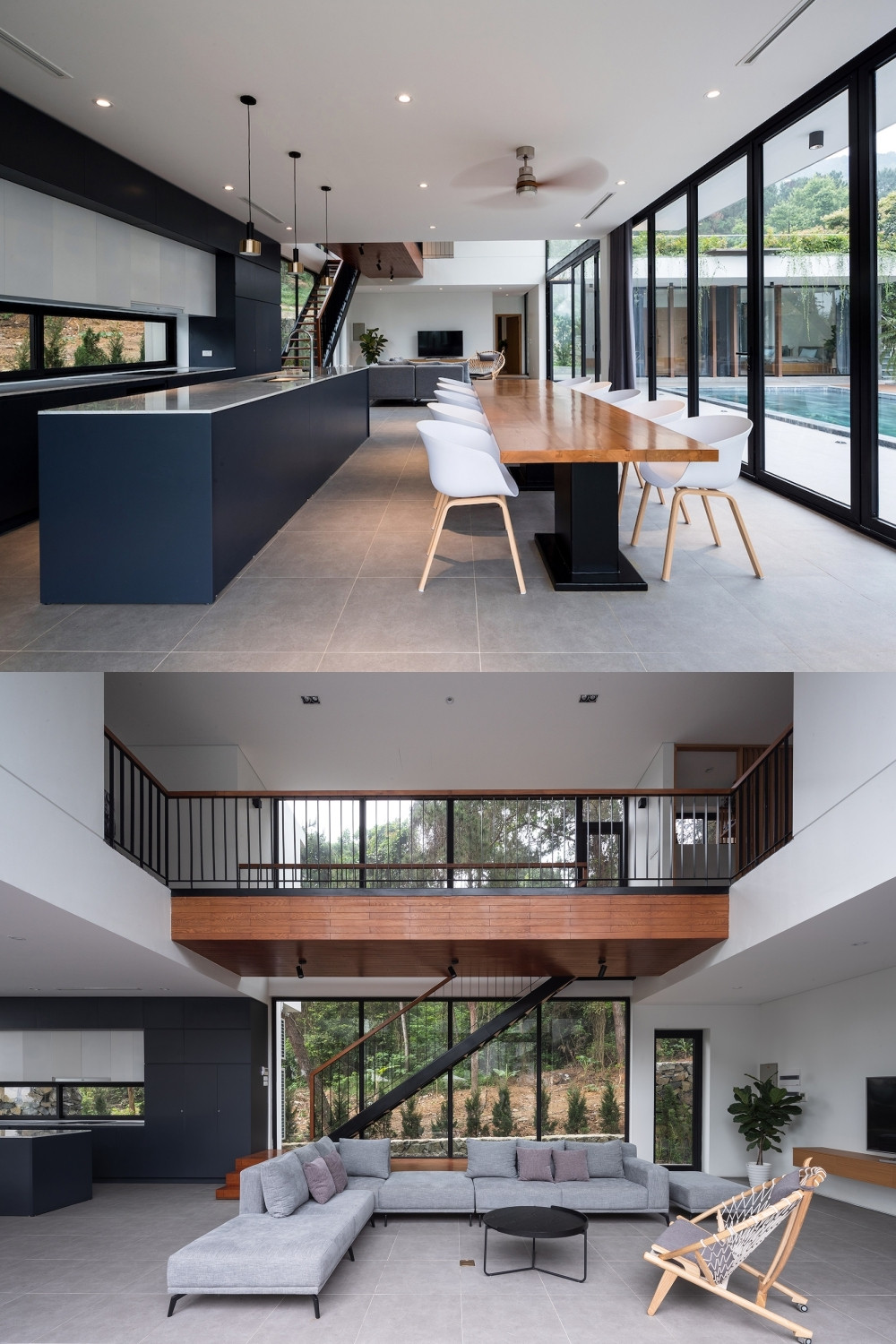 Phòng khách thông với phòng bếp, nằm dọc theo bể bơi. Nội thất đơn giản với màu xám, trắng, nâu gỗ tạo vẻ hiện đại và thoáng đãng. Sàn màu bê tông kéo dài từ trong nhà ra sân làm mờ ranh giới giữa bên trong và bên ngoài.
