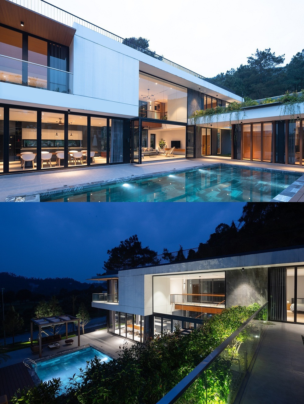 Biệt thự trên mảnh đất 1.000 m2 ở Tam Đảo là tổ ấm của một đôi vợ chồng cùng hai con nhỏ, thường xuyên đón ông bà đến thăm. Họ mong muốn một không gian "mở", nhiều kết nối với thiên nhiên và giữa các thành viên. Bên cạnh đó, vì công trình nhìn xuống đồi cỏ và hố cát, xung quanh lại có rừng thông, gia chủ không muốn tác động nhiều đến cảnh quan để tận hưởng thiên nhiên và khí hậu.