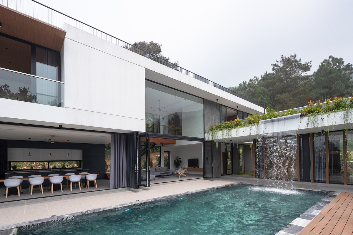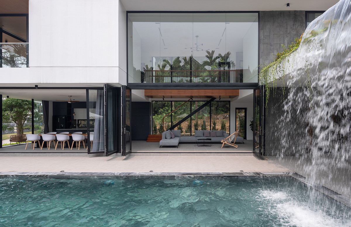 Không chỉ tạo cảnh quan, thác nước còn kết nối các bậc địa hình và góp phần làm mát căn nhà. Nó đòi hỏi hệ thống tuần hoàn với bể bơi, bơm áp lực cao và được điều chỉnh hoạt động tùy theo ý muốn chủ nhà. Bên cạnh bể bơi có sàn gỗ đặt ghế nằm và lối đi dẫn lên khu vực bàn ăn ngoài trời ở mái khối nhà tầng một.
