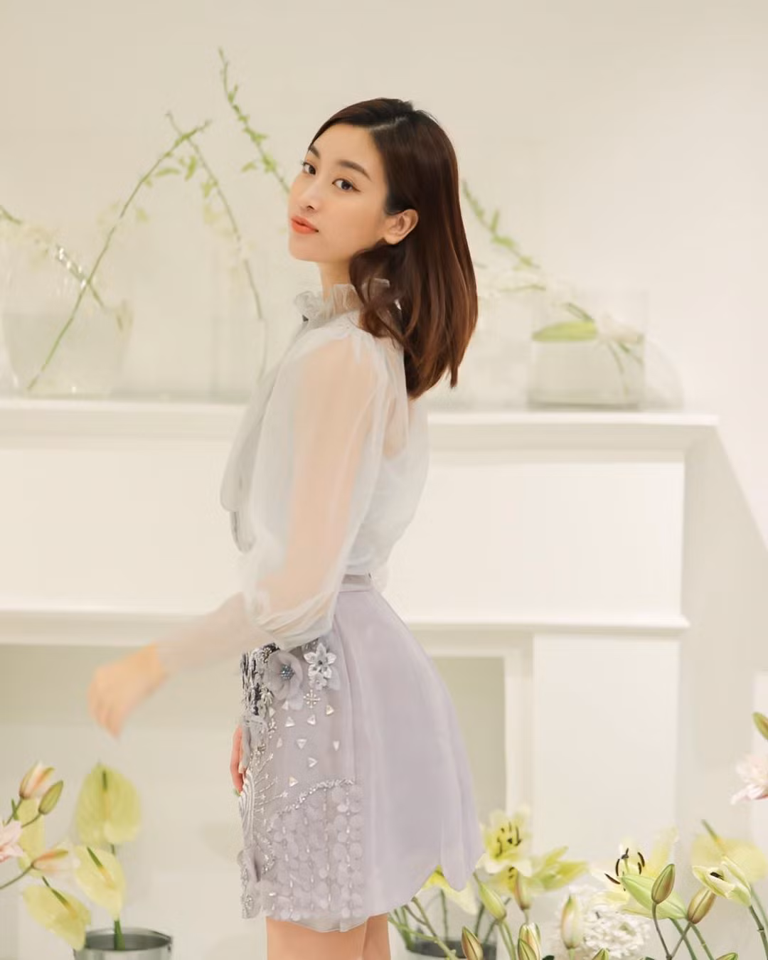 Hoa hậu Mỹ Linh đẹp như một 'nàng thơ' trong bộ váy gam màu pastel nhẹ nhàng.