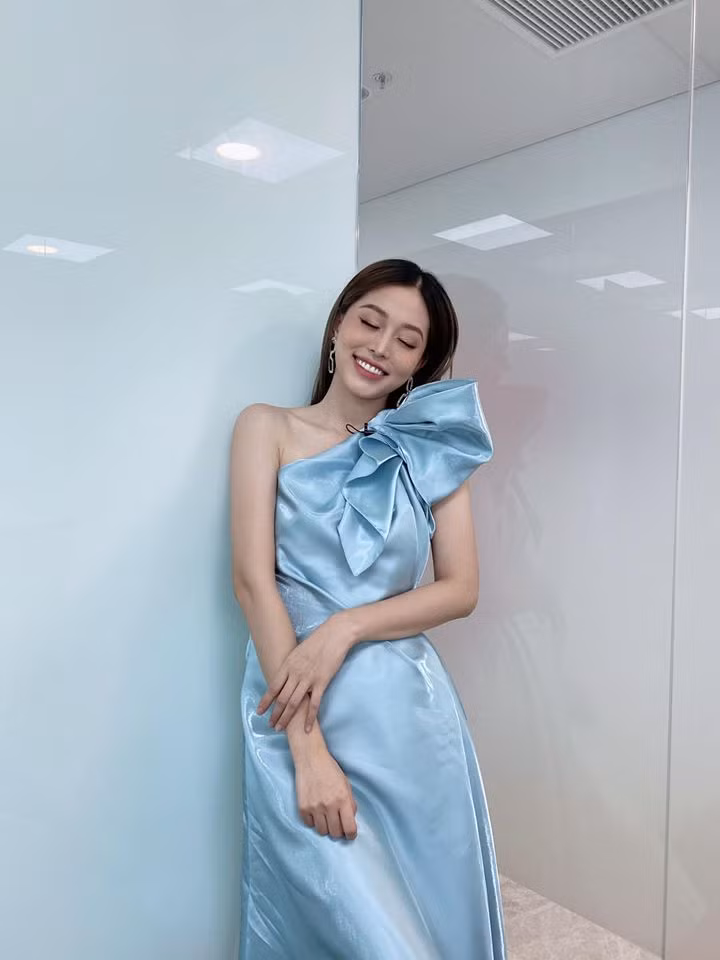 Á hậu Phương Nga khoe vai trần quyến rũ trong bộ váy lụa lệch vai màu xanh pastel.