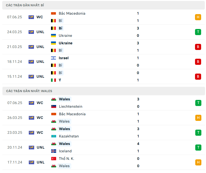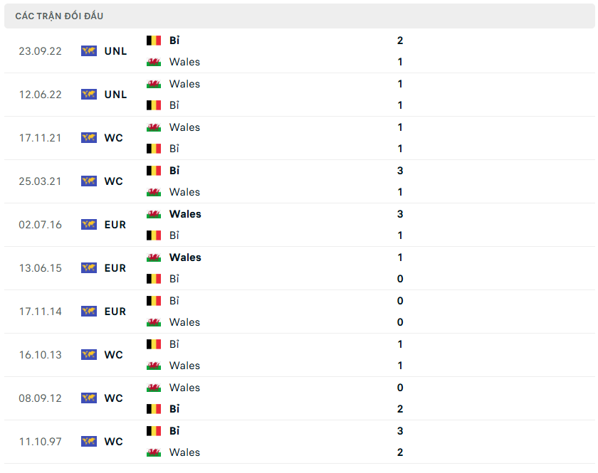 Lịch sử đối đầu, phong độ Bỉ vs Wales