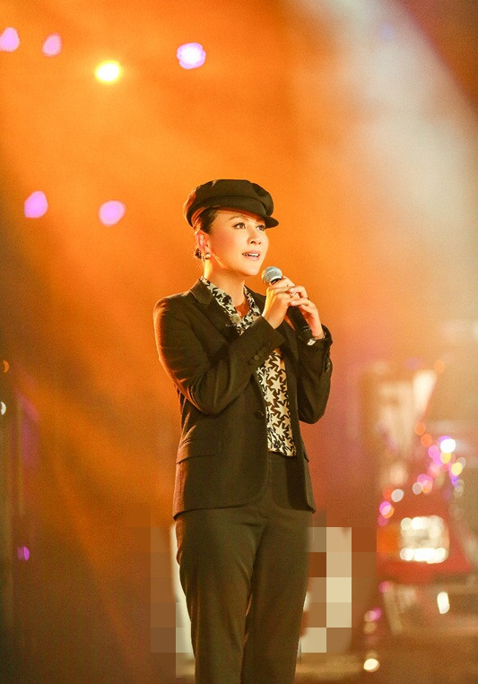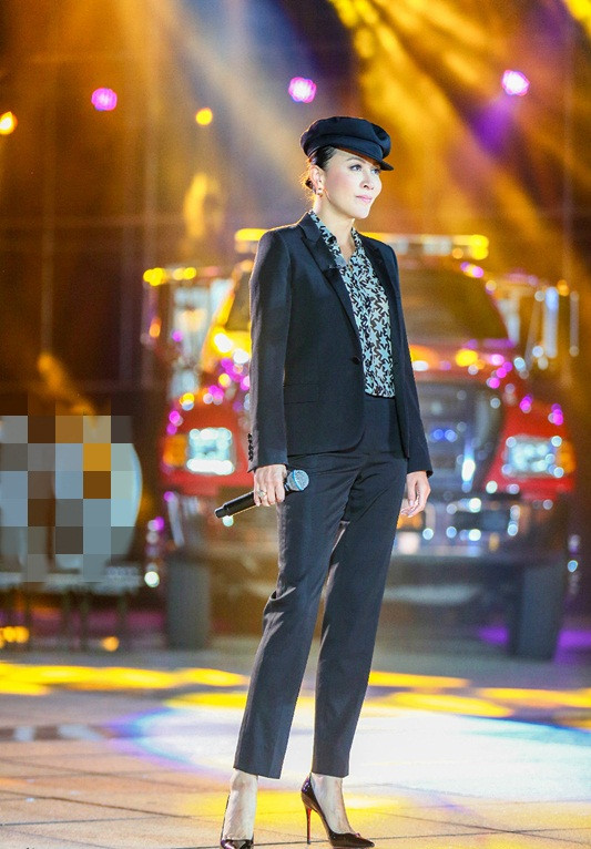 Vợ tài tử Lương Triều Vỹ dáng vóc thon gọn trong bộ suit đen thanh lịch.