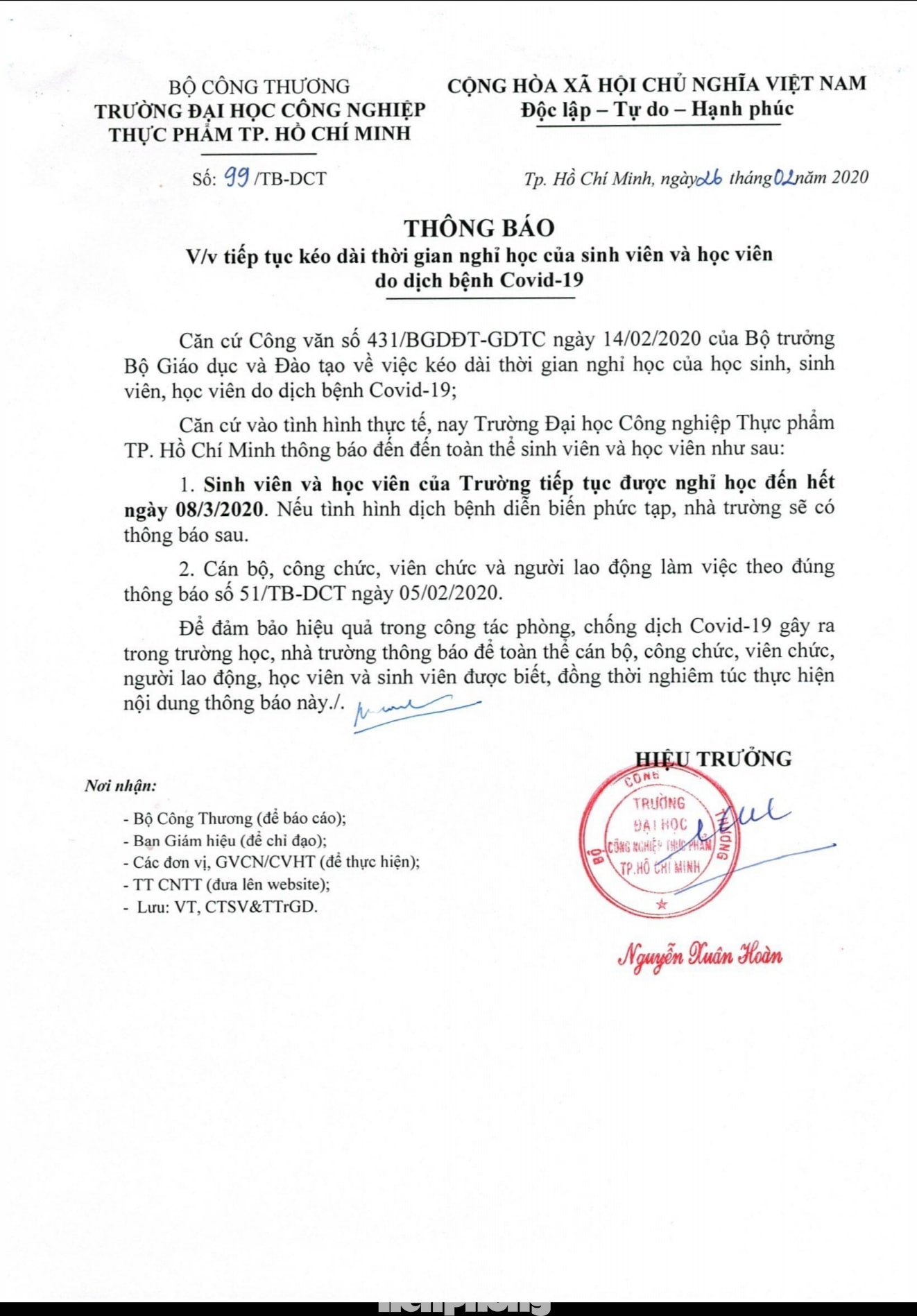 Tương tự, PGS- TS Nguyễn Xuân Hoàn, Hiệu trưởng Trường ĐH Công nghiệp Thực phẩm TPHCM cũng vừa ký văn bản về việc kéo dài thời gian tạm nghỉ học đối với sinh viên của trường. Theo đó, nhà trường cho rằng, trước tình hình ngày càng phức tạp của dịch bệnh Corona, Ban Giám hiệu nhà trường thông báo sinh viên nghỉ học đến hết ngày 08/03/2020. Sinh viên chủ động tìm hiểu các biện pháp phòng, chống dịch bệnh (mang khẩu trang, sử dụng nước sát khuẩn nhanh, hạn chế đi ra ngoài, tụ tập nơi đông người…).